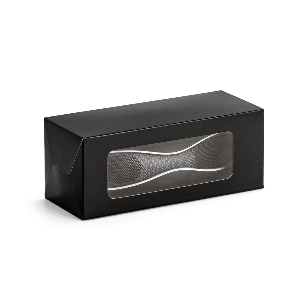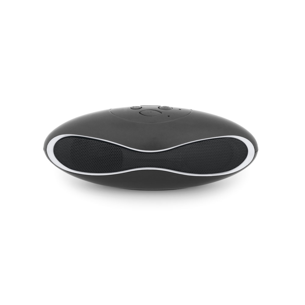 Caixa de som portátil com microfone, em ABS e acabamento emborrachado. transmissão sem fios BT v3.0, potência de 3W/4Ω e autonomia aproximada de 3 h. Função para atender chamadas, controle de volume e conexão à playlist do dispositivo móvel. Incluso cabo USB para carregar. Fornecida em caixa presente. 150 x 56 x 58 mm | Caixa: 155 x 60 x 60 mm.
