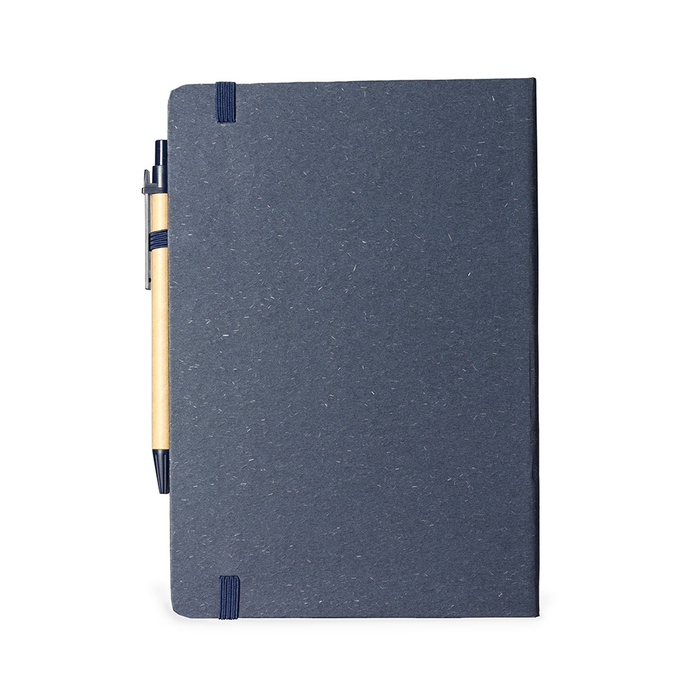 Caderneta ecológica com capa em fibra da palha de arroz. Contém aproximadamente 80 folhas amareladas com pauta, além de duas folhas de guarda, uma fita elástica para fechamento e porta-canetas em elástico. Acompanha uma caneta esferográfica de carga azul de 1,0mm com corpo em papelão e clip, acionamento por clique e ponteira em plástico.