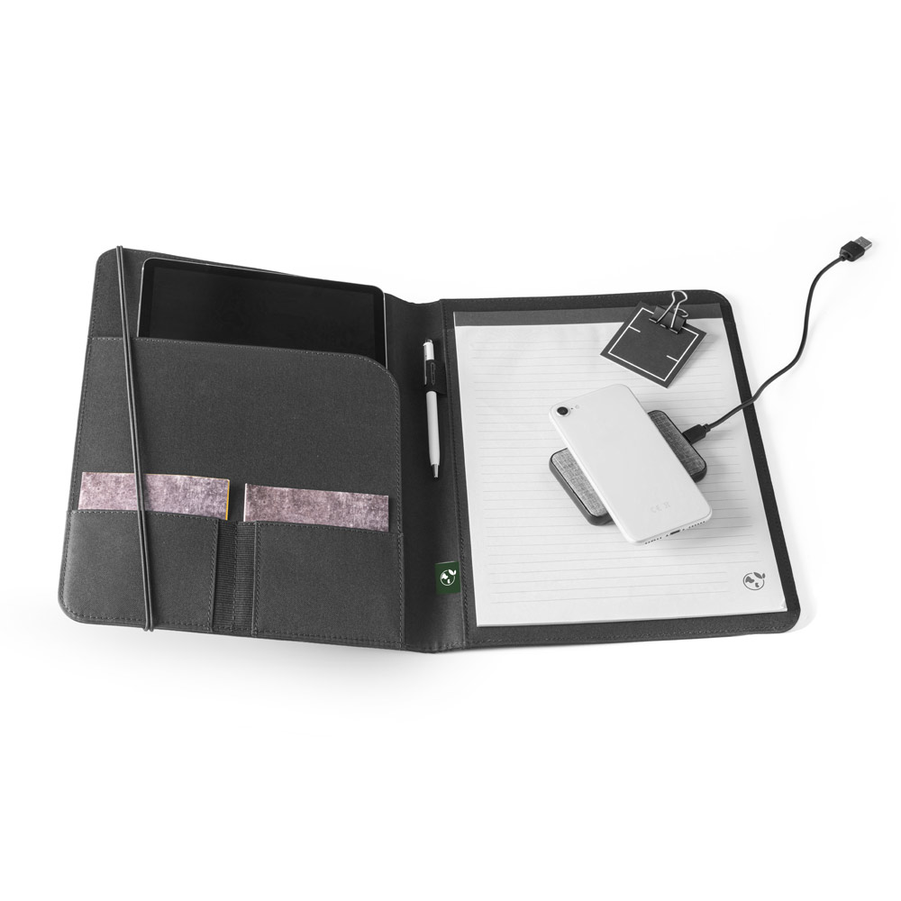 Pasta A4 em poliéster 100% reciclado 300D, com elástico para fecho. O interior contém vários bolsos, suporte para esferográfica (não inclusa) e um caderno com 40 páginas pautadas, em papel proveniente de gestão florestal sustentável. Fornecida em bolsa non-woven. 230 x 330 x 50 mm.