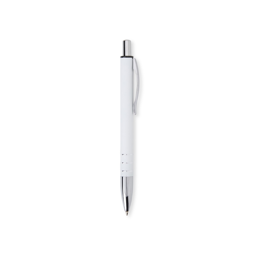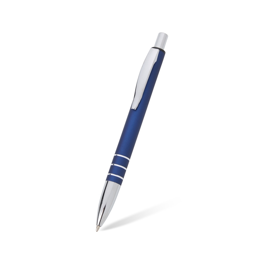 Caneta metálica com acabamento fosco, clipe metálico e ponteira plástica. Carga esferográfica azul 1.0mm e acionamento por clique.