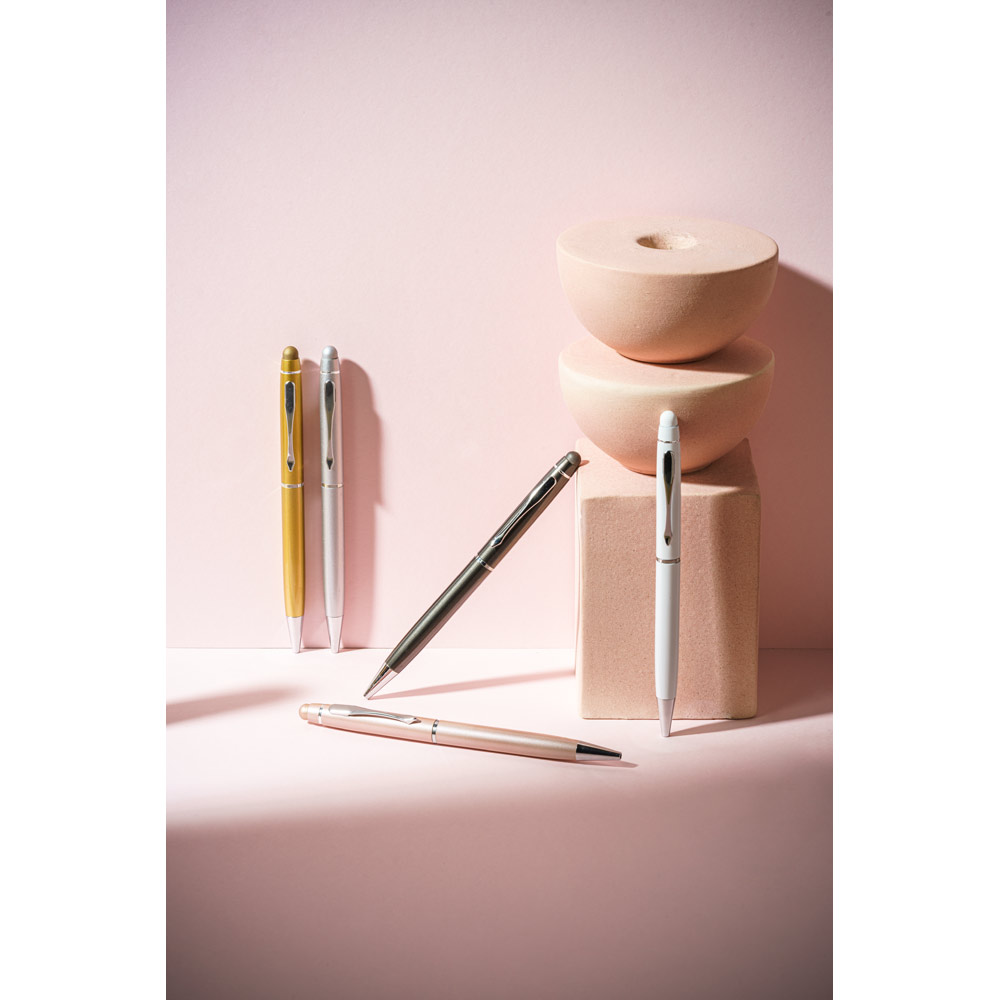 Esferográfica em alumínio com ponteira touch e mecanismo twist. Escrita em azul até 1,5 km. Fornecida com estojo de oferta desmontado. ø10 x 141 mm | Estojo: 150 x 15 x 19 mm.