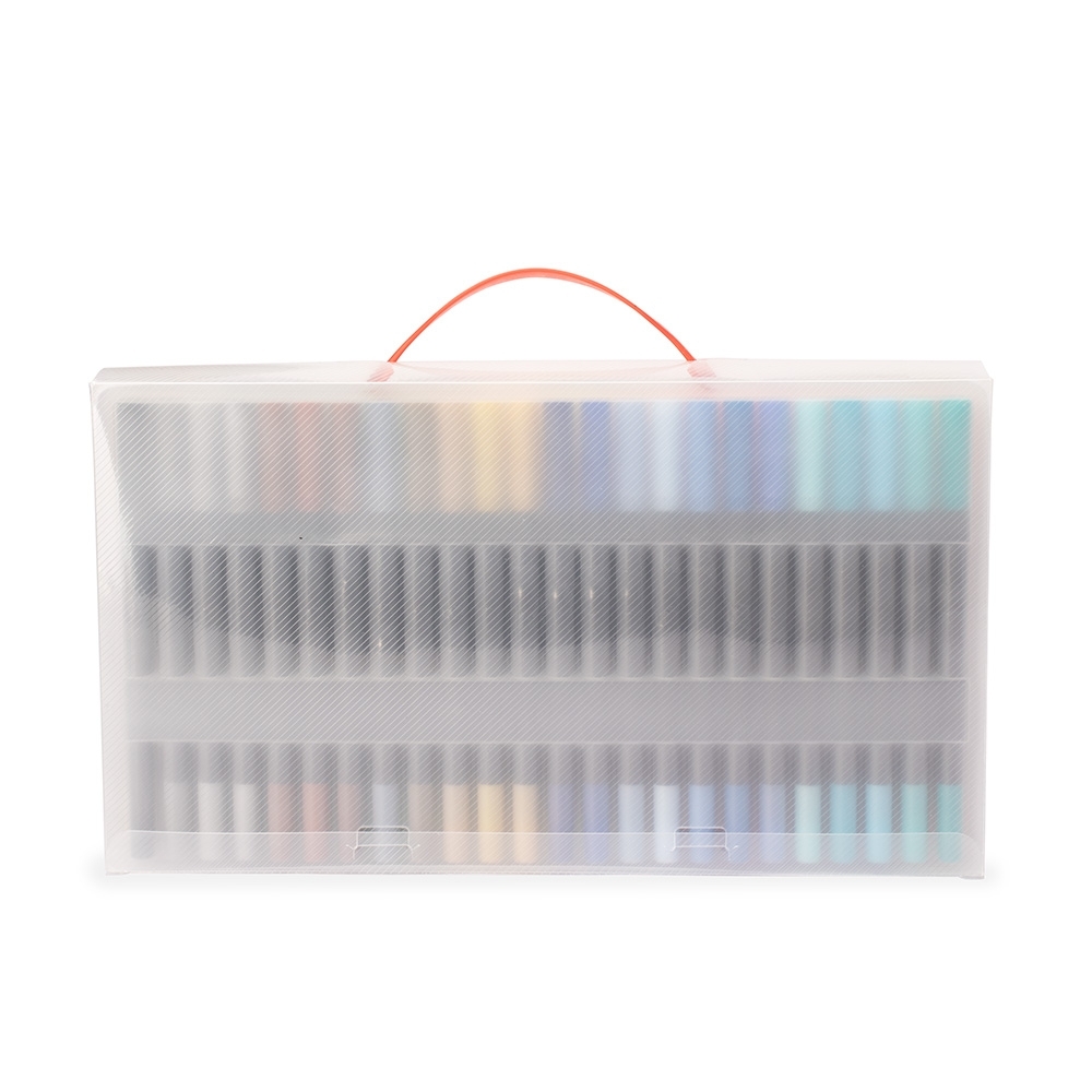 Kit com 72 canetinhas coloridas de pontas duplas: uma fina e outra em formato de pincel. Cada canetinha possui corpo leve em plástico e tinta à base de água, livre de odores e atóxica. Acompanha estojo plástico com fechamento em botões e alça para transporte.