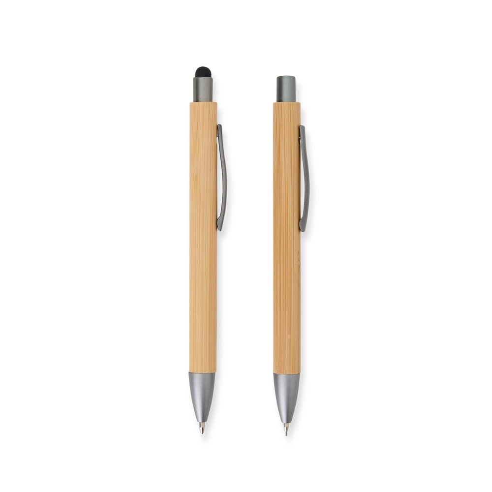 Descrição: Nosso Kit Ecológico de Caneta e Lapiseira de Bambu é excelente para quem busca um toque sustentável no dia a dia. A lapiseira possui acionamento por clique, e a caneta conta com carga esferográfica azul de 1.0mm e função touch para quem precisa de toques precisos em dispositivos. Além disso, acompanha uma embalagem que imita bambu. Uma ótima escolha para presentes corporativos ou para quem ama escrever sem abrir mão da consciência ecológica!