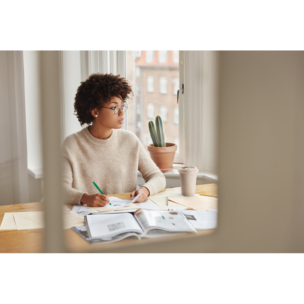 Copo de viagem em fibra de bambu (60%) e PP (40%) com tampa flip top. Capacidade até 380 mL. Certificação EU Food Grade. Ø95 x 113 mm.