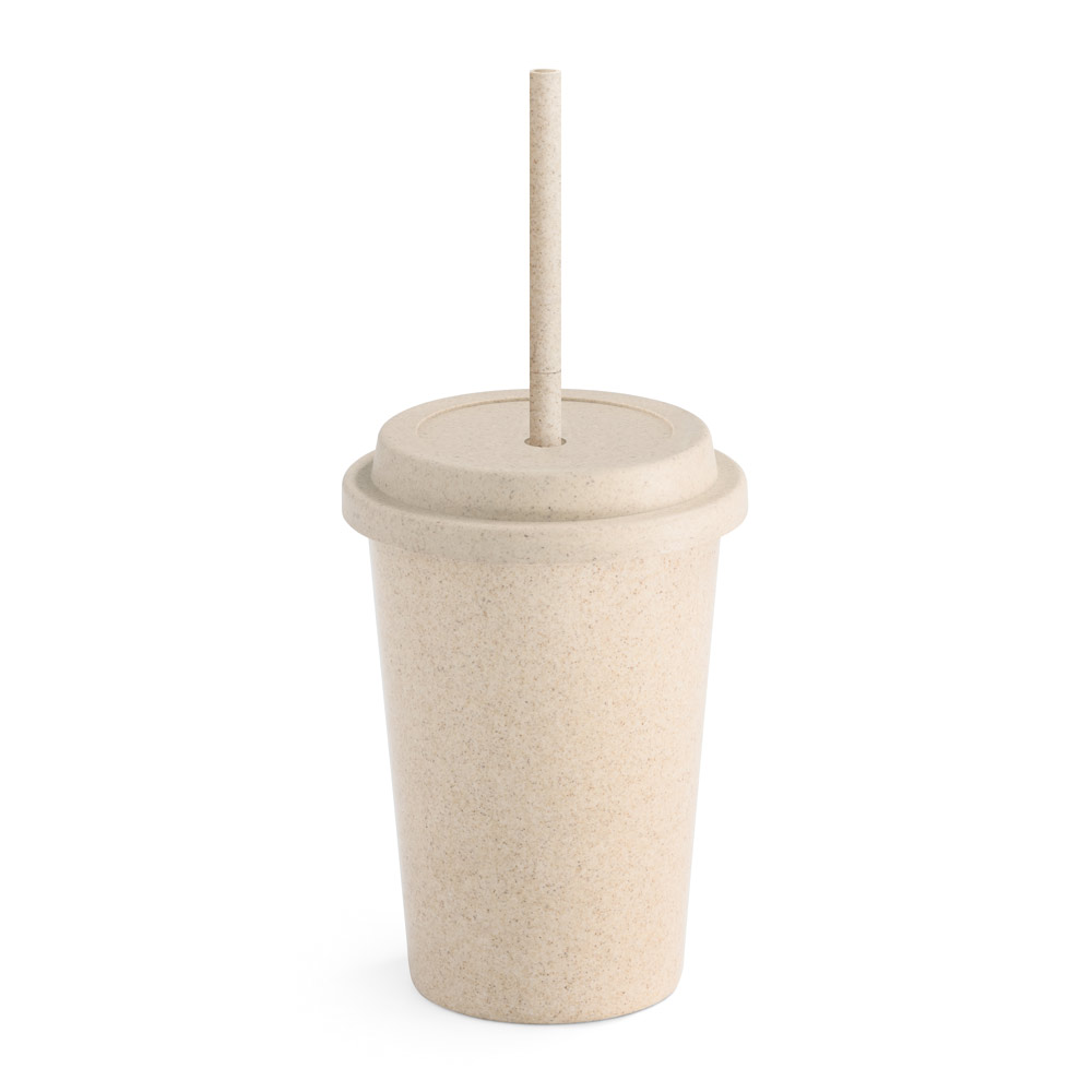 Copo de viagem em fibra de bambu (60%) e PP (40%) com tampa e canudo retráctil. Capacidade até 450 mL . Pode ocorrer transferência de calor. Certificação EU Food Grade. ø93 x 135 mm.