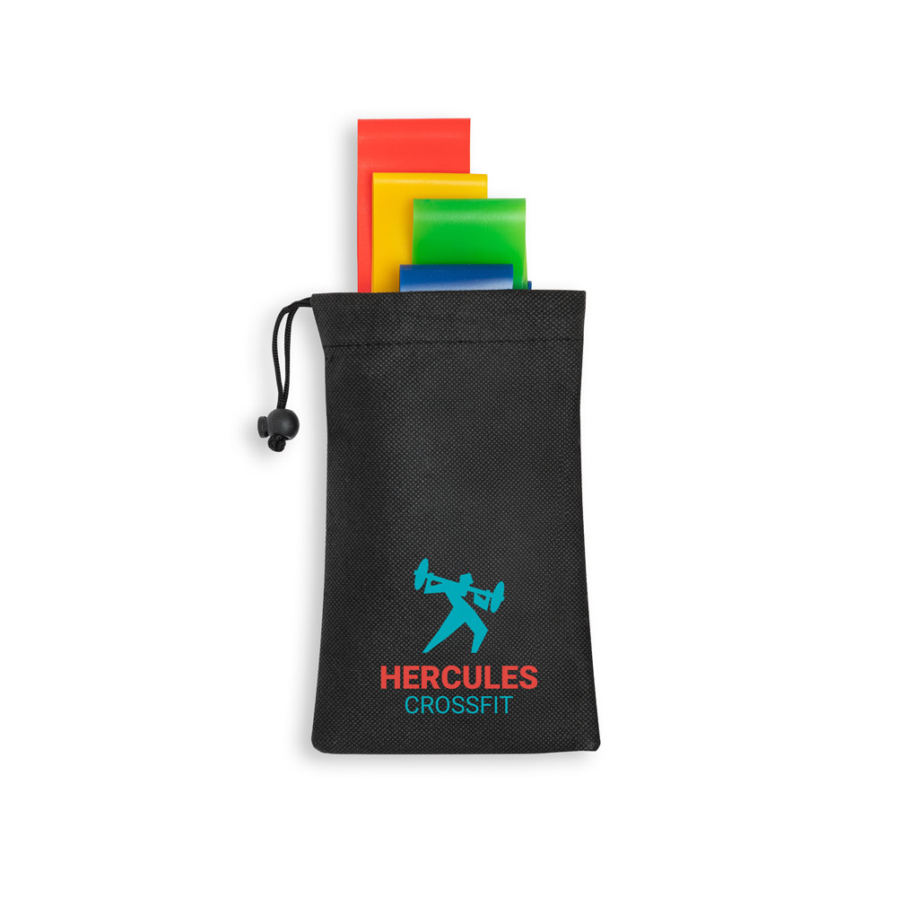 Descrição: Conjunto de 4 bandas elásticas de ginástica em bolsa de non-woven preta. Cada banda tem um nível de resistência diferente: Vermelha – forte; Amarela – média; Azul – leve; Verde – muito leve. Bolsa: 100 x 200 mm.