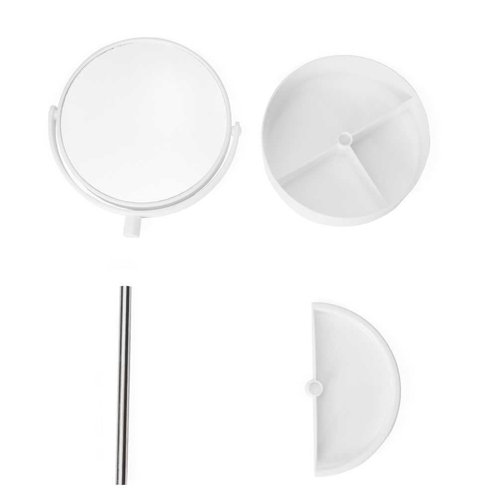 Espelho de mesa dupla face giratório com design moderno e funcional. Com base e moldura de plástico e pedestal de alumínio, ele é fácil de montar e adequa-se bem a qualquer ambiente. Sua base contém três divisórias para guardar objetos diversos.