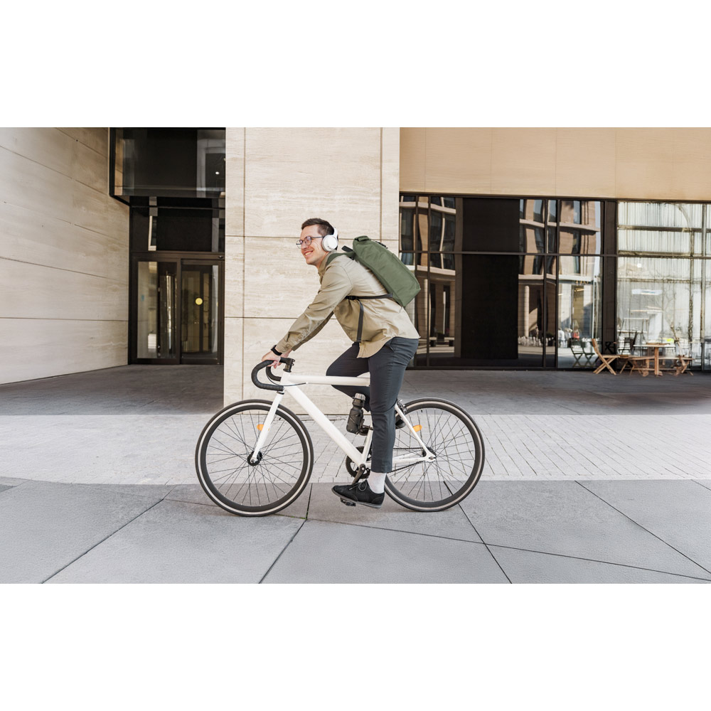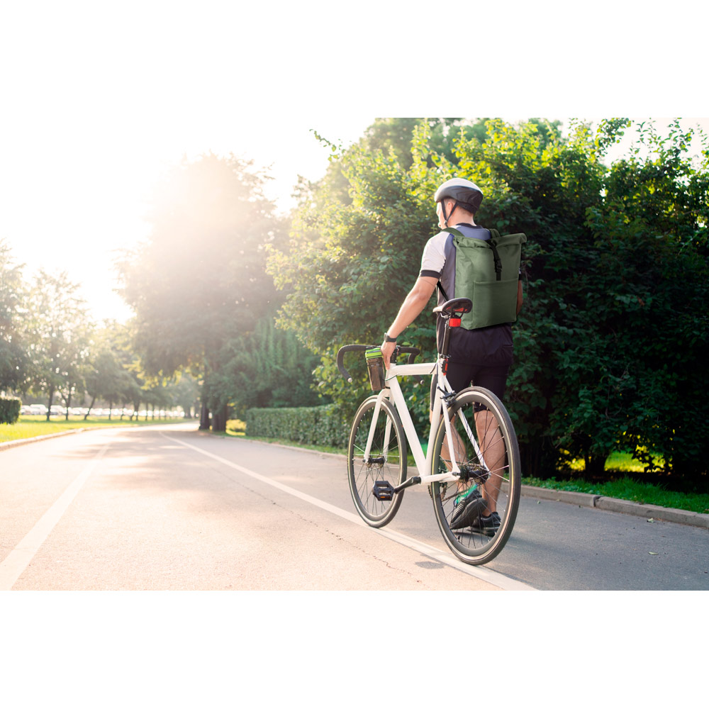 Mochila “Roll-top” para notebook em 600D e forro em 210D. Possui um compartimento principal espaçoso para notebook até 17.3″, com fecho de enrolar no topo. Bolso frontal com zíper. Capacidade até 21 L. 320 x 440 x 130 mm.