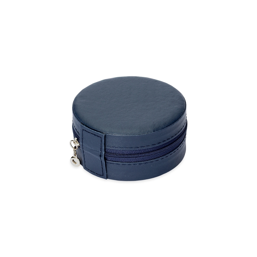 Porta-joias de formato redondo em couro sintético e fechamento em zíper. Possui revestimento interno aveludado, além de três pequenos ganchos, um bolso com elástico, divisórias removíveis e almofadas fixas para abrigar anéis.