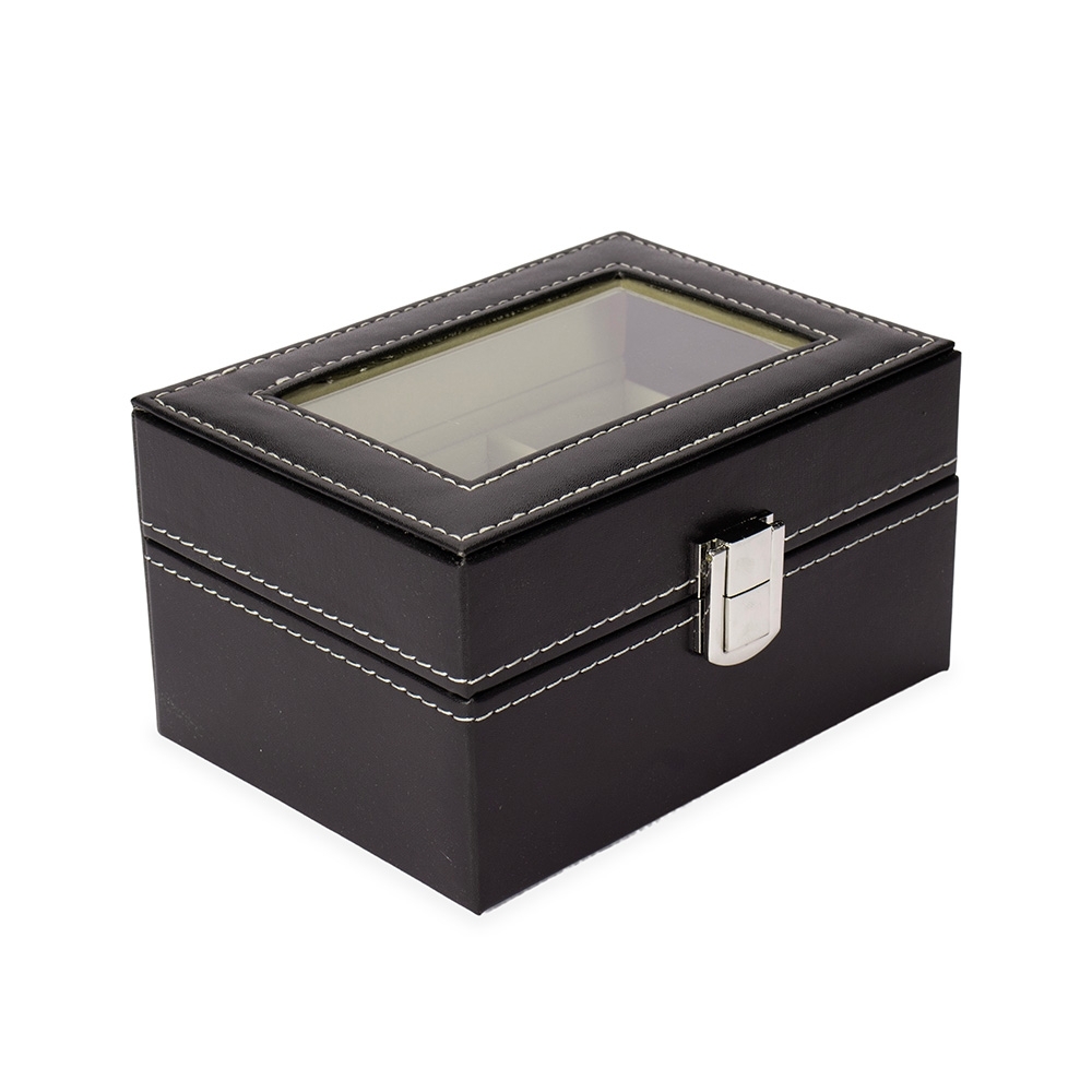 Porta-relógios com acabamento em couro sintético à base de PVC. Apresenta revestimento interno aveludado e três compartimentos fixos com almofadas removíveis de espuma, além de viseira em vidro e trava de segurança para o fechamento do estojo.