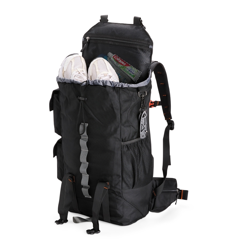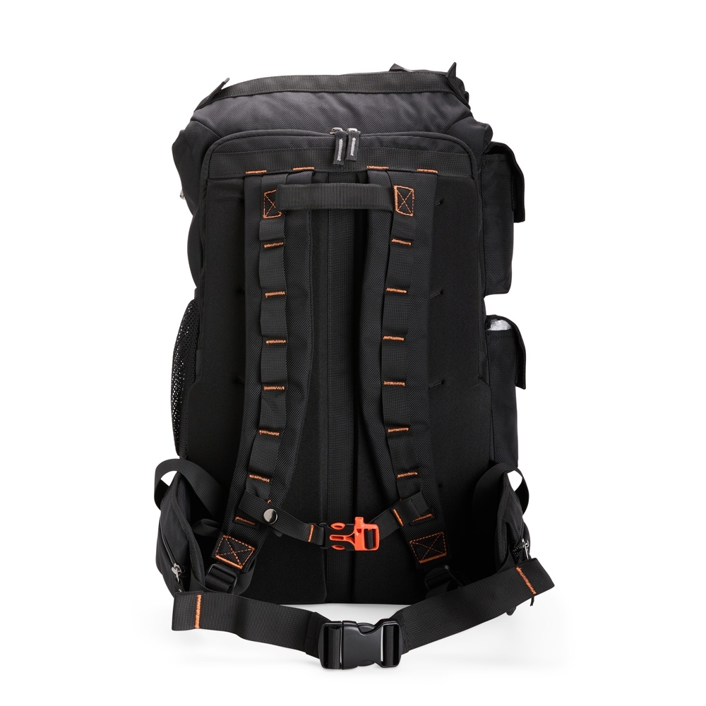Mochila confeccionada em poliéster impermeável, fechamento por cordão e engate rápido plástico e capacidade máxima de 24 litros. Possui amplo espaço interno com divisória com fechamento em velcro e bolso em tela de nylon próximo à abertura. Apresenta três compartimentos externos: um com fechamento em zíper e dois em velcro nas laterais, além de um bolso lateral em tela de nylon. A parte traseira da mochila conta com outros três compartimentos em diferentes tamanhos, incluindo espaço para notebooks de até 15,6 polegadas.