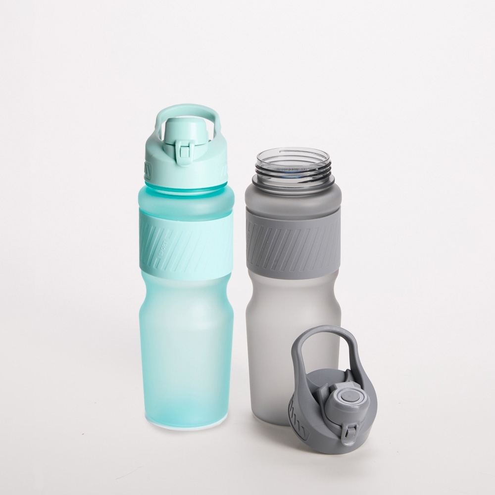 Squeeze plástico com acabamento fosco e capacidade de até 750ml. Possui luva emborrachada, tampa rosqueável com bocal e alça fixa para transporte. O bocal conta ainda com uma tampa de proteção com trava de segurança.